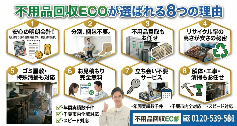 千葉不用品回収ECOでは、「お客様第一主義」を徹底。スピード対応、価格、品質のすべてにおいて最高のサービスを提供し、千葉市の不用品回収業界で選ばれ続ける企業であり続けます。