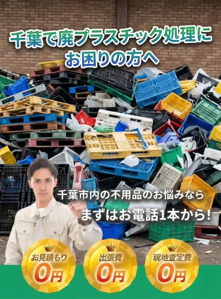 千葉市・千葉県内の拠点より無料見積もりに参ります。プラスチックの種類(単一か混合か等)や状態を確認し、適正な処分料金をご提示します。即日対応も可能です!